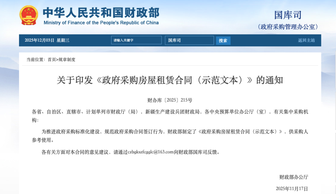 为推进政府采购标准化建设,规范政府采购合同签订行为,财政部制定了《政府采购房屋租赁合同(示范文本)》,供采购人参考使用。